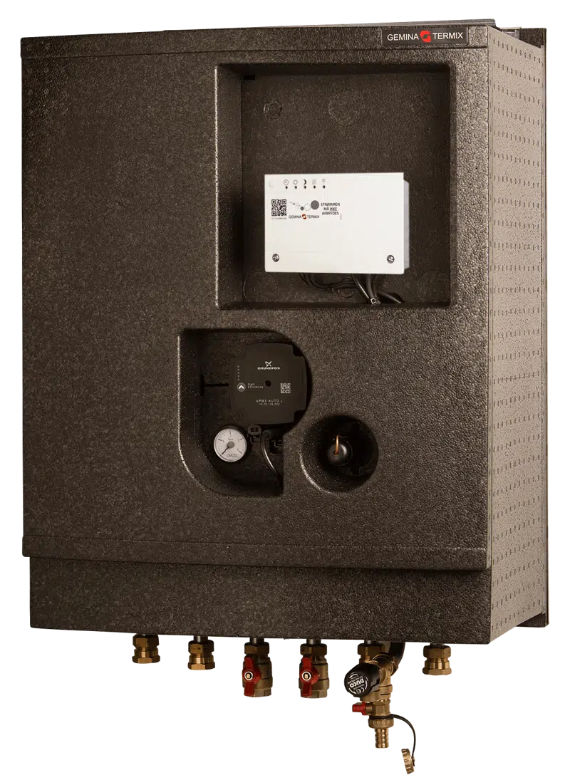 Det viste fjernvarmeanlæg er en Gemina Termix ECL 120-model. Med vejrkompensering styres og overvåges varmeanlægget optimalt. Uanset vejret udenfor reguleres varmeanlægget konstant ift. de valgte parametre og forhindrer dermed overforbrug. Regulatoren kan indstilles til spareperioder efter behov for at opnå yderligere besparelser.
